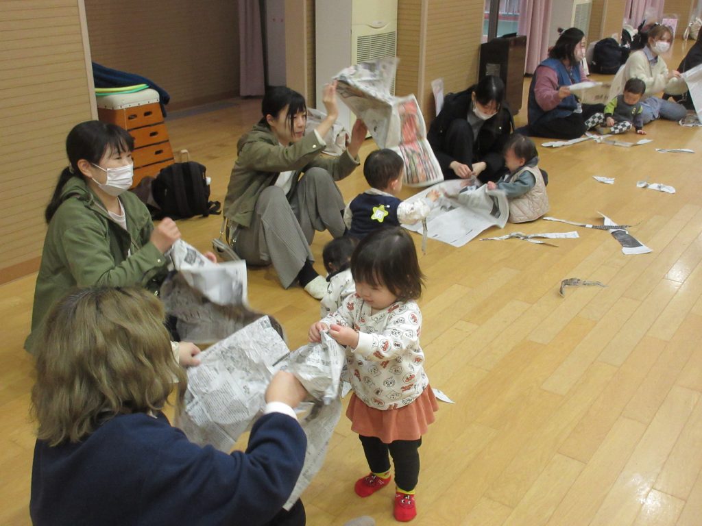 曲に合わせて新聞をちぎって遊びました。
