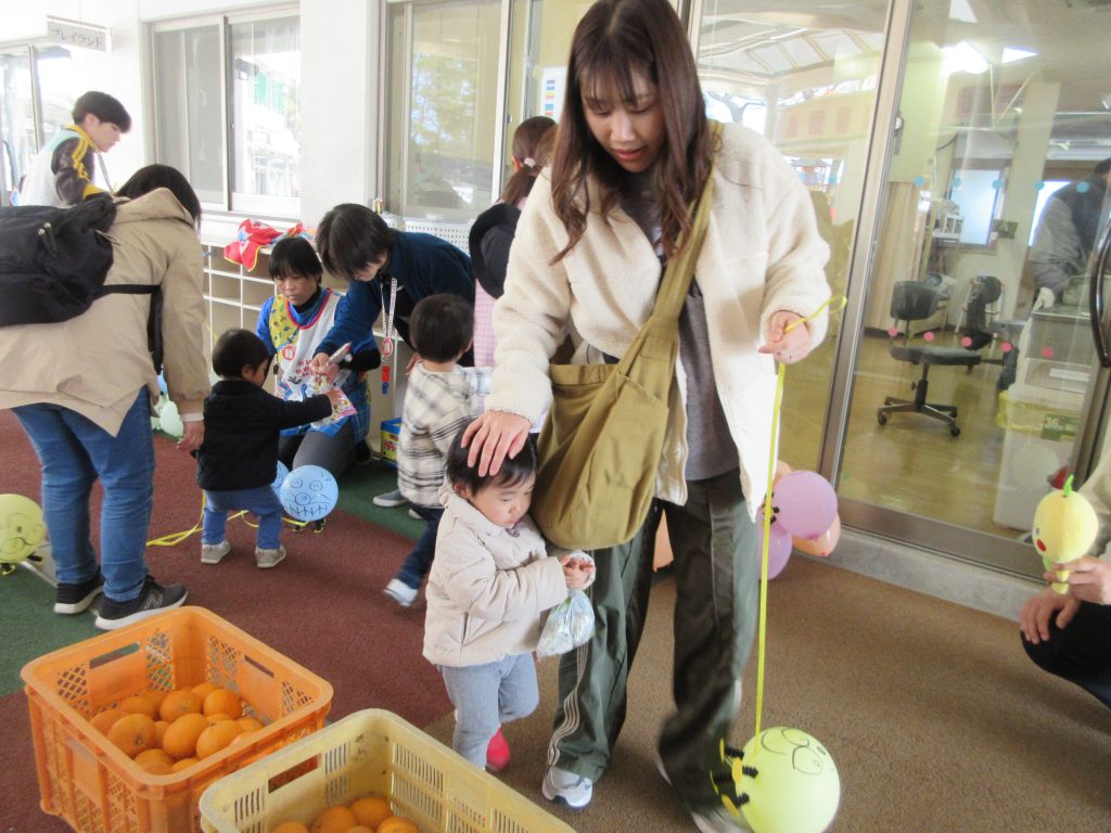広い園庭で遊んだり、幼稚園で飼っている「うさぎ」とふれあったりしました。アンパンマン&バイキンマンの歩く風船と、幼稚園のお山で収穫した、夏みかんを持ち帰っていただきました。今年度のわくわくキッズは終了しました。次回はきらきら組(プレ保育)でお待ちしております。
