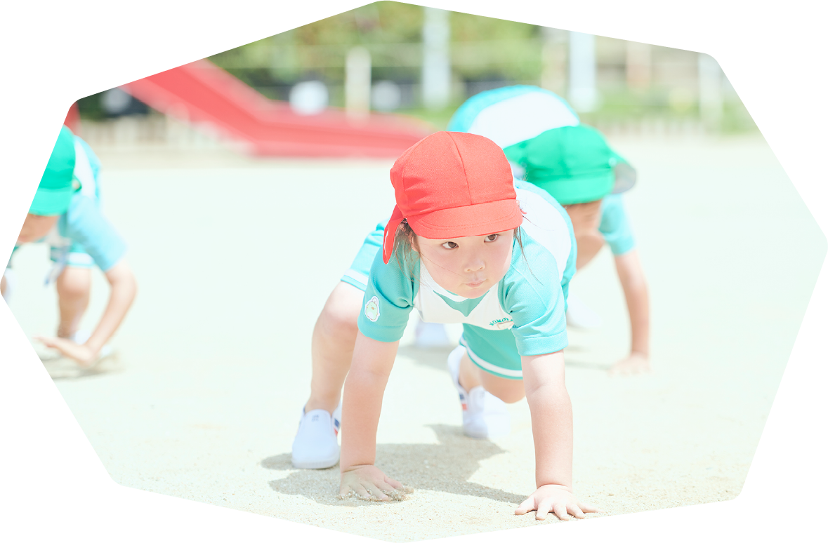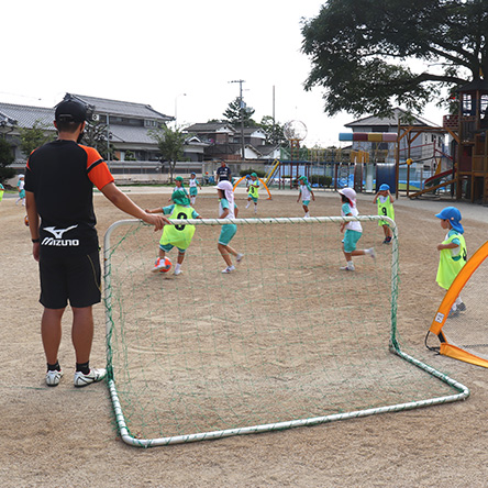 桃山幼稚園園庭にて年長児を対象に体を動かすことの楽しさ、仲間と一緒にがんばることの大切さ、できた!という喜びと達成感をサッカーを通じてお子様にお伝えします。