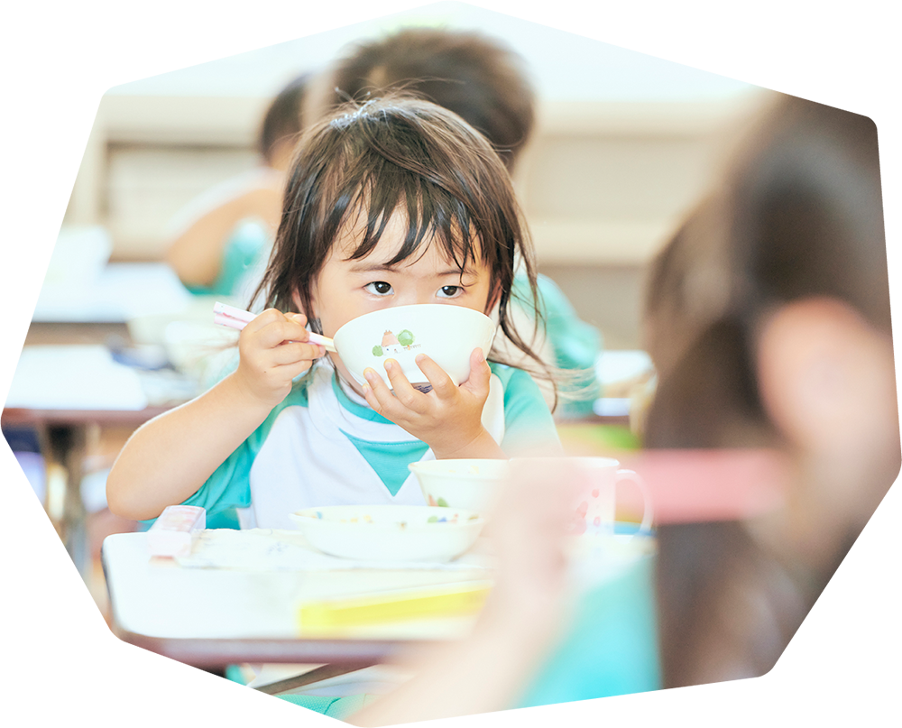 味覚が発達するこの時期に、桃山幼稚園での食体験が、成長してからも子どもたちに正しい食べ物の選択ができるように、 育って欲しいという想いをなお強くし、専任の栄養士の指導のもと、心をこめて給食を作っています。
