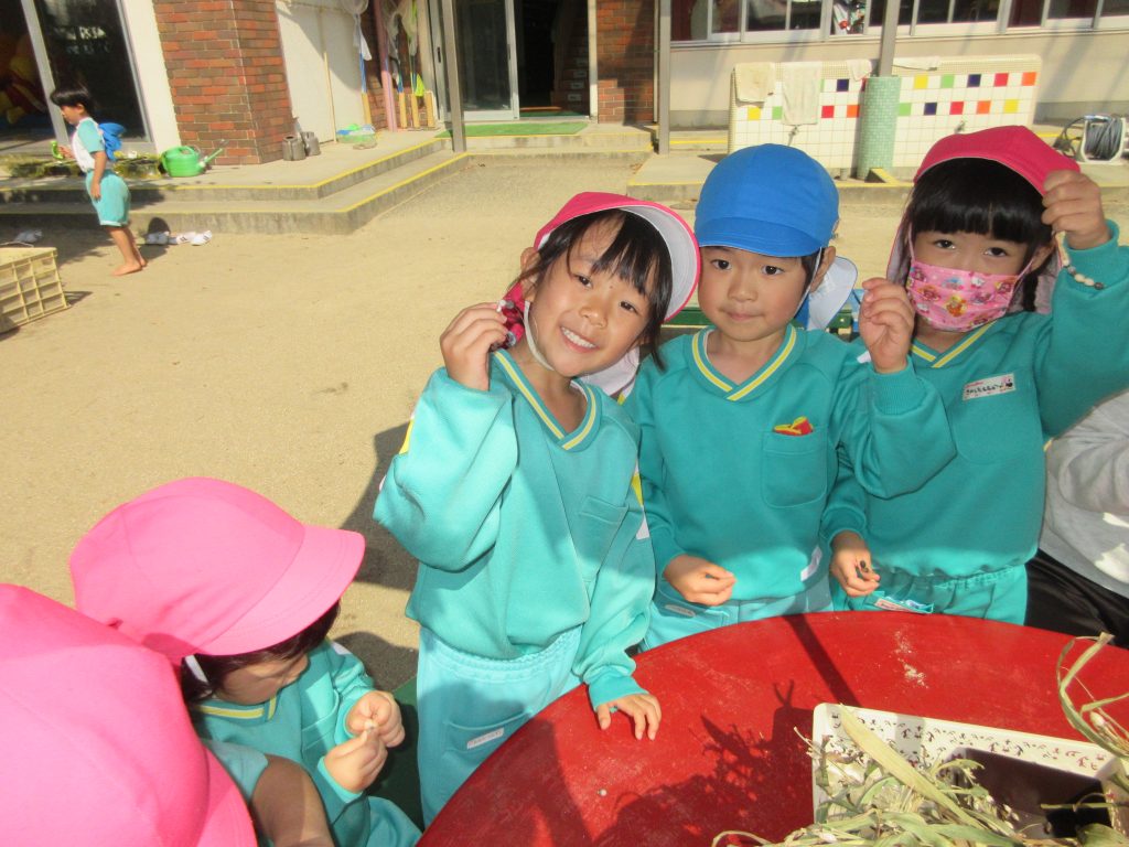 先生たちが”数珠玉”を採ってきてくれました。なかなか細かい作業でしたが先生に