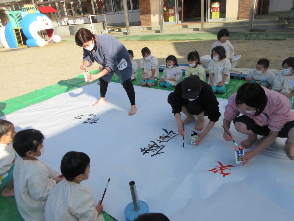 今日は園庭で書き初め大会を行いました。風が冷たくてヒヤッとする寒さでしたが、子どもたちは裸足になり腕まくりをしてやる気満々!縦割りのグループで好きな音楽を流しながら、長い用紙に字や絵を書いていきました♪今年の目標や頑張りたいことを書いている子も(^-^) 皆は何を書いたのかな~