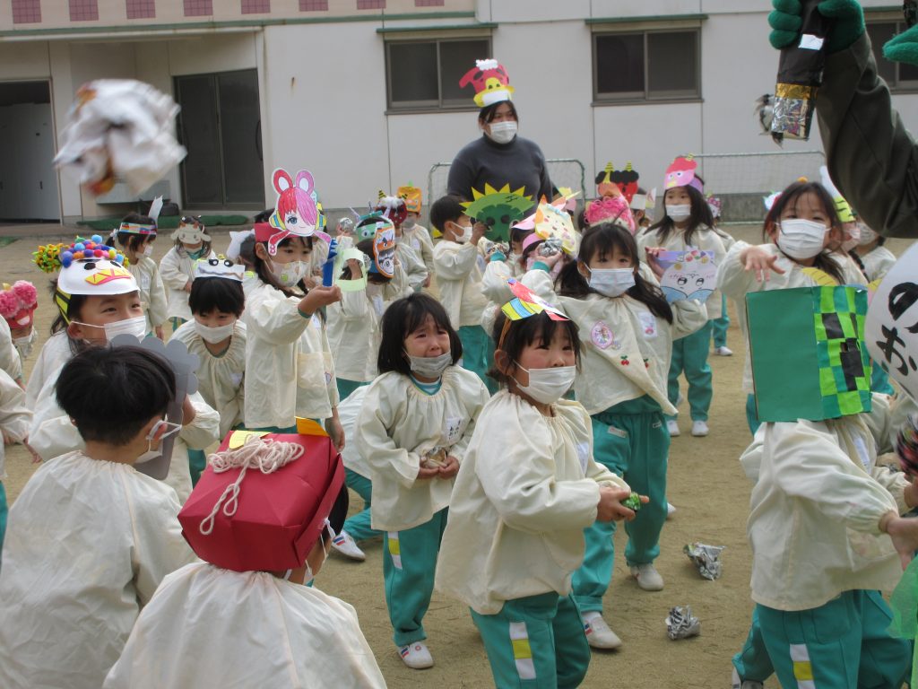 鬼退治の仕方を習って、準備万端!!ドコドコドコドコ~!!という音がしてついに、鬼たちがやって来ました。キャ~!!と歓声が。うそつき鬼・いじわる鬼・なきむし鬼・おこりんぼ鬼・よわむし鬼が揃いました。みんなの心の中には、この鬼さんたちはいないかな~退治したい鬼さんに新聞豆で鬼退治!!「鬼は~外!福は~内!」