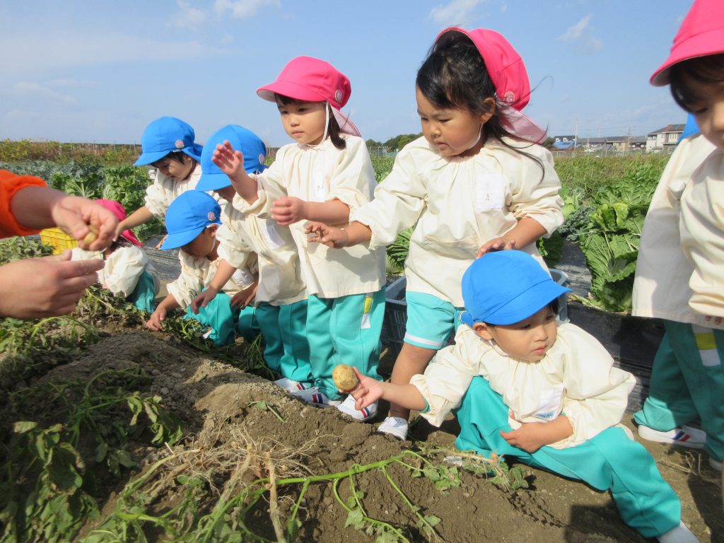 土の中に隠れているじゃがいもを見つける時に、教師が「土の中からじゃがいもの声が聞こえるよ」と声を掛けると、土の上に耳を傾けて「ここにいるよ~きこえた!!」と言って、声が聞こえてた所を頑張って掘っていました( ´艸`)