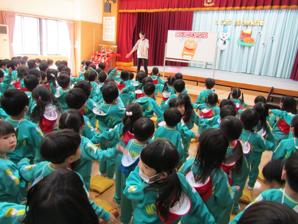 先生の出し物は、「寒い時に食べたい物は何かな~?」と聞いてみると、「うどん」「おでん」「みそ汁」等が出てきましたが・・・ラーメンが食べたいということで「ラーメン体操」をして体を温めました。「ラーメン大好きラーメン大好き つるっ!!つるっ!!つるっ!!」と歌いながら体操をしていましたよ。お家でも一緒に体操してみて下さいね!(^^)!