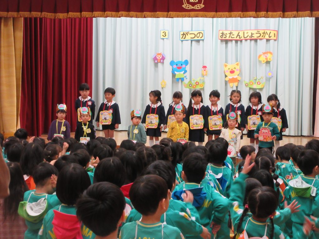 みんなから、言葉と歌のプレゼントをしました。今年度最後のお誕生会です。これからも、すくすく大きくなってくださいね。