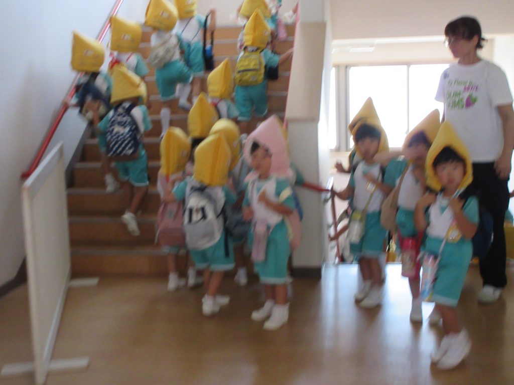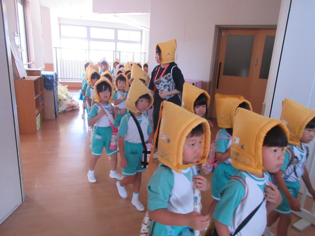 日々の取り組みで、防災頭巾を被り、防災リュックを背負うのも上手になっています。