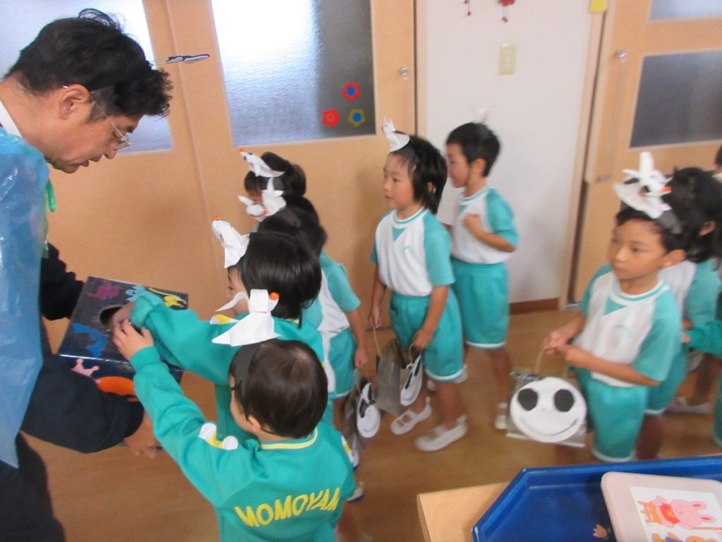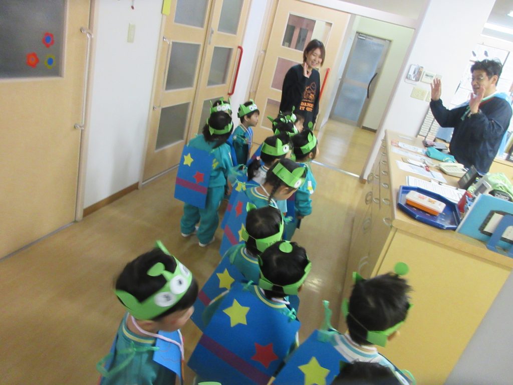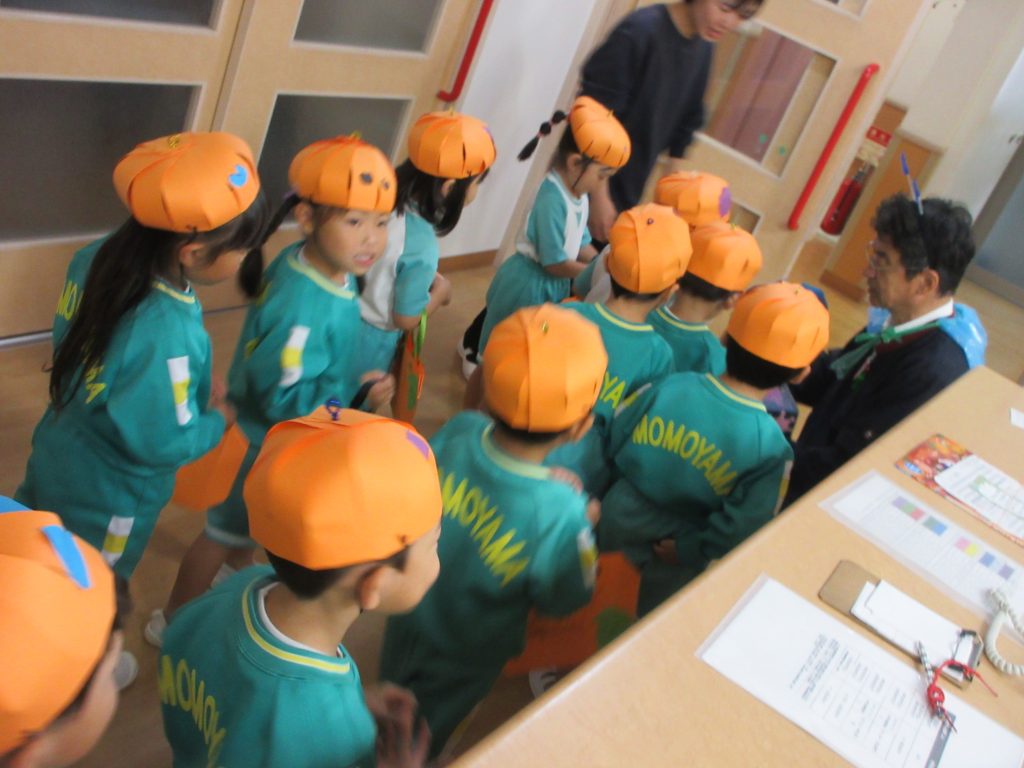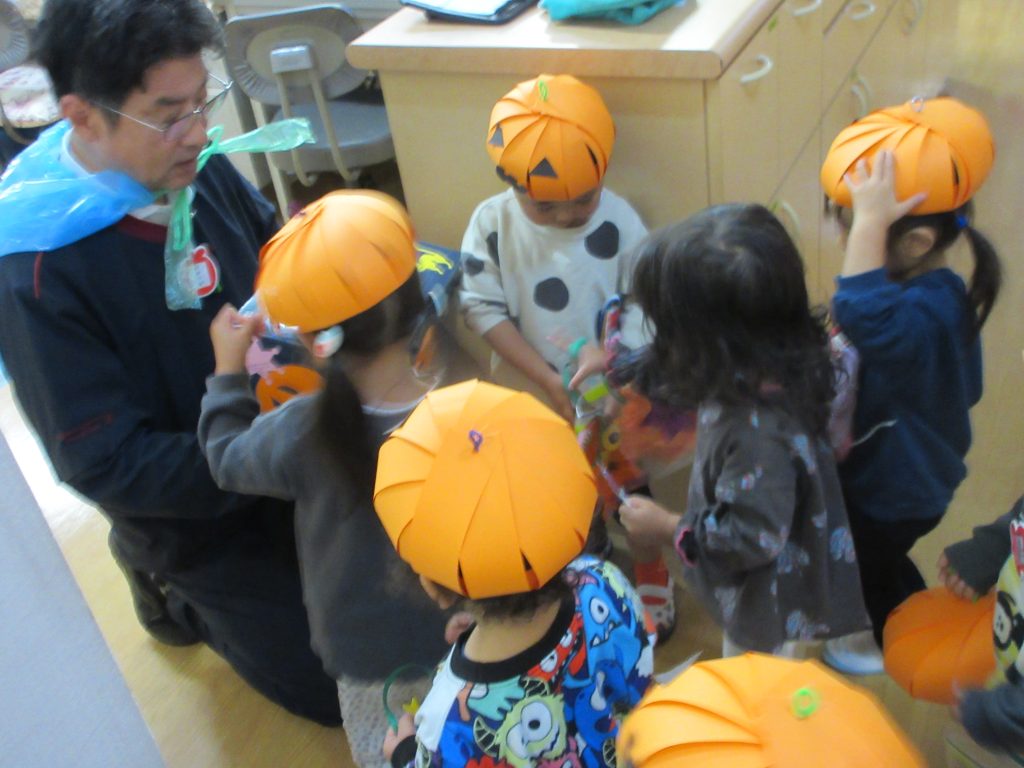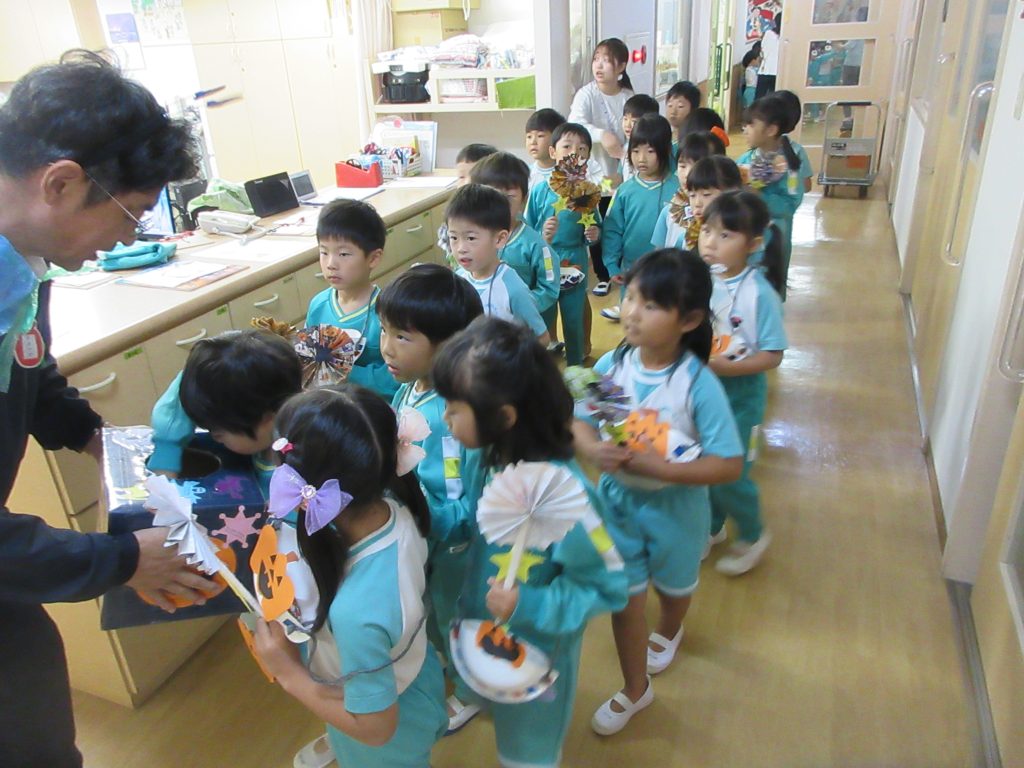 「トリックオアトリート」「おかしをくれなきゃ いたずらしちゃうぞー!!」と、園長先生の所に行ってお菓子をもらっていました。