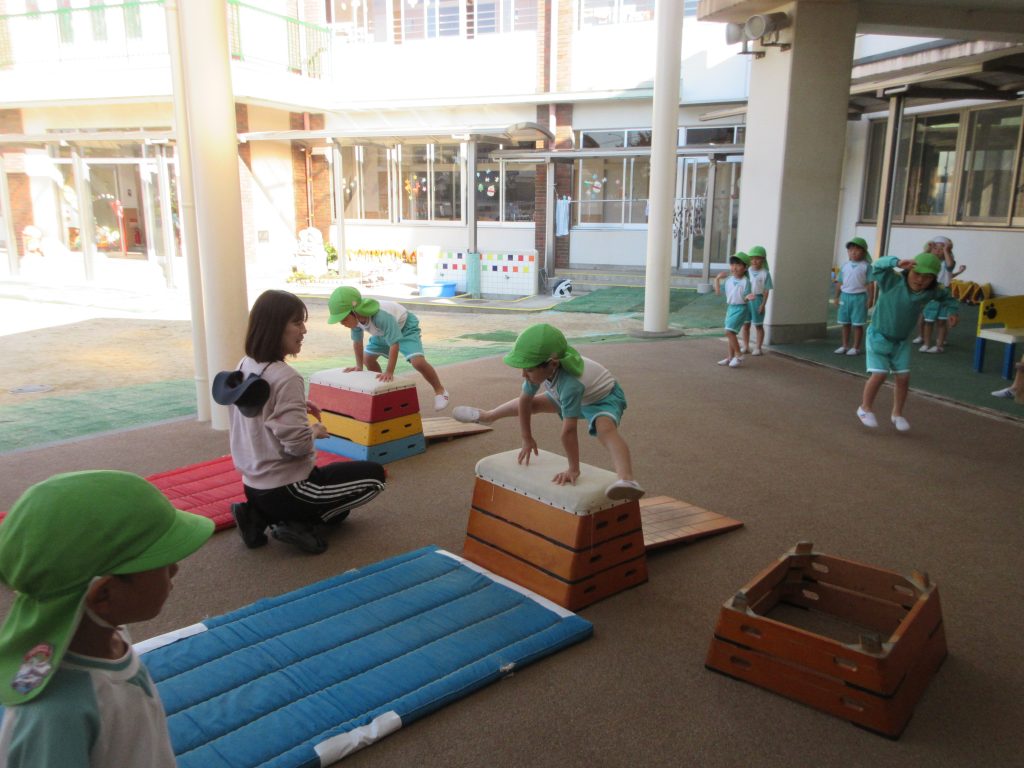 年中組が「総合運動」をしました。今日の指導は、担任ではない先生の指導です。しかし、いつものような取り組みが見られました。