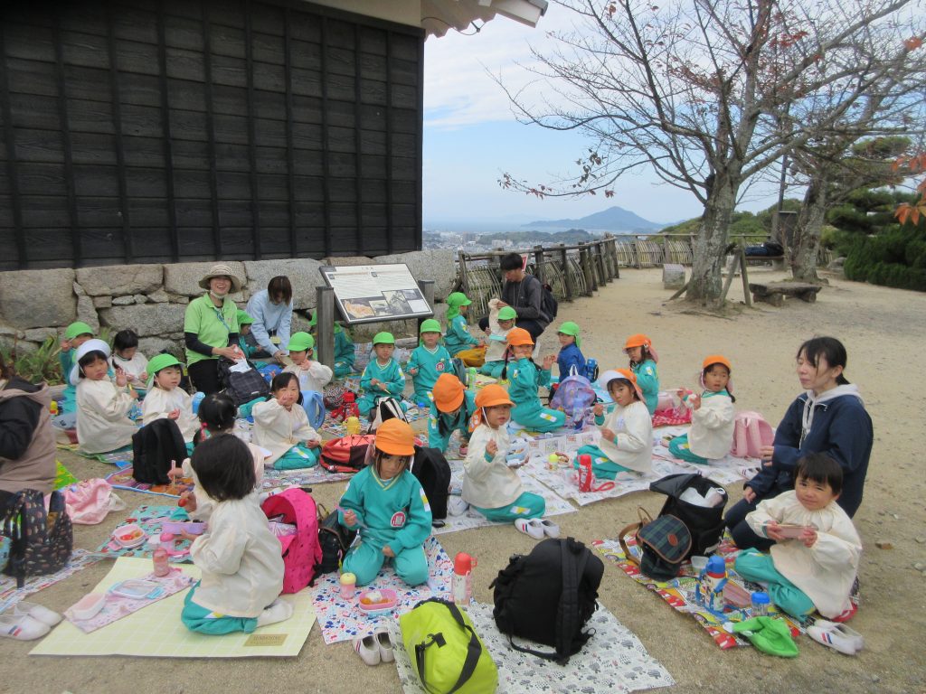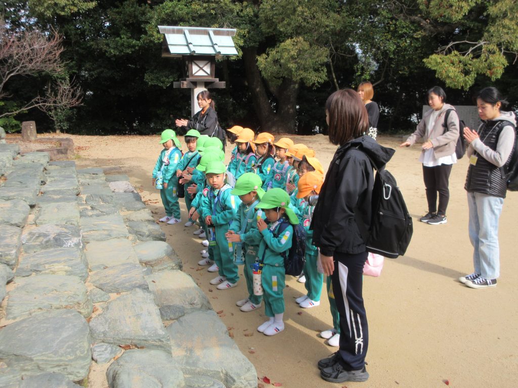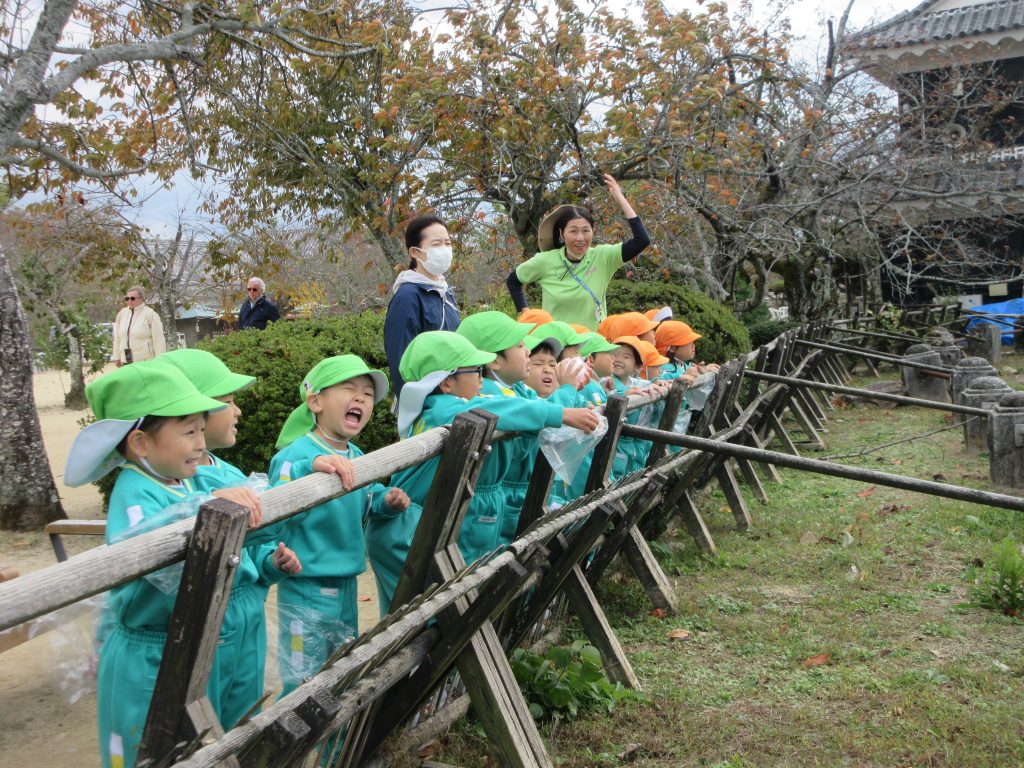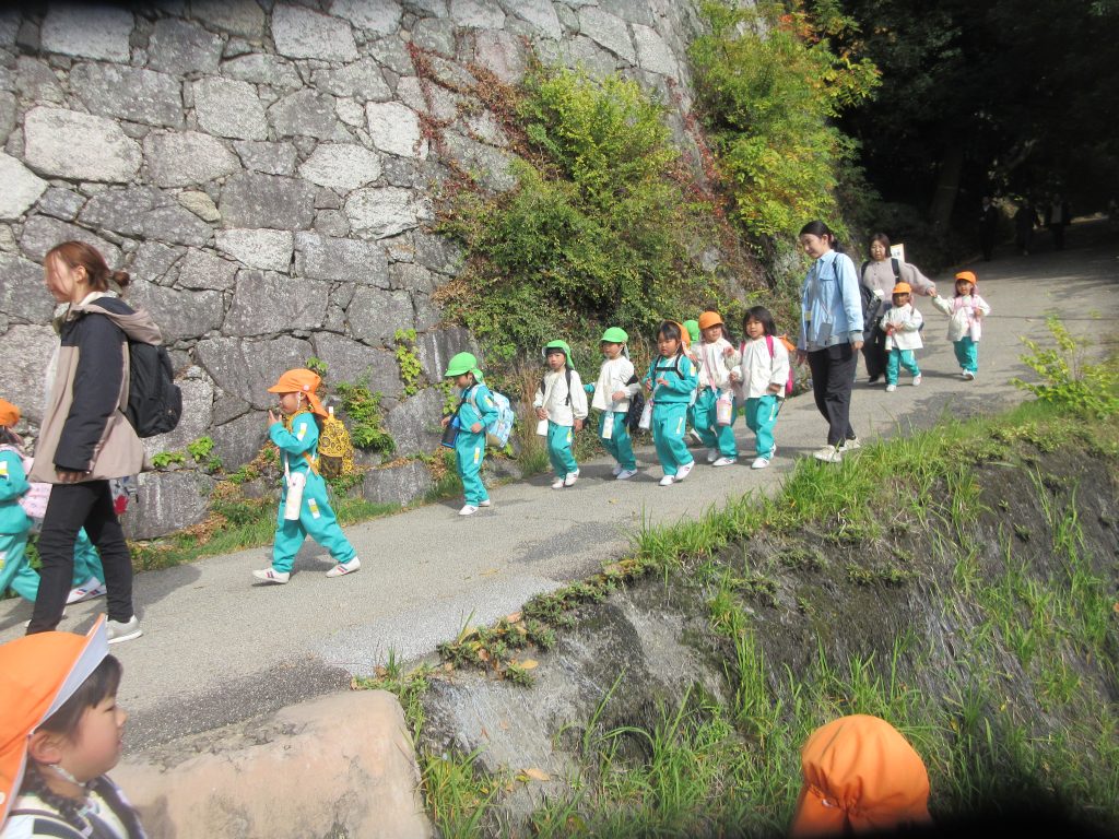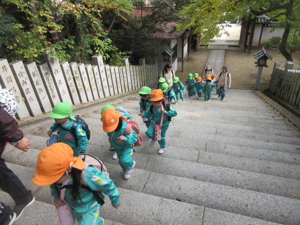 11月18日(火)年中組が遠足で「松山城」に行きました。東雲神社の階段から登りました。一段一段しっかり足を上げて頑張っていました。