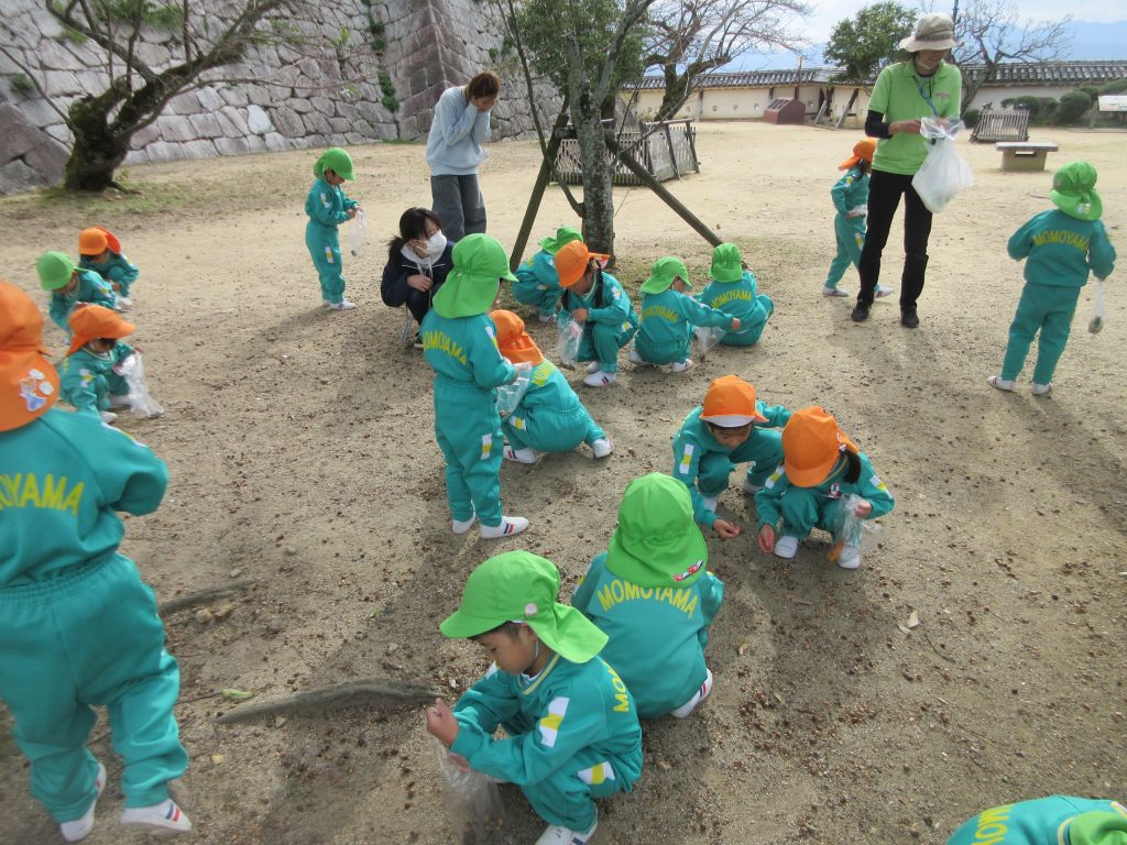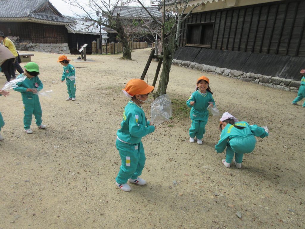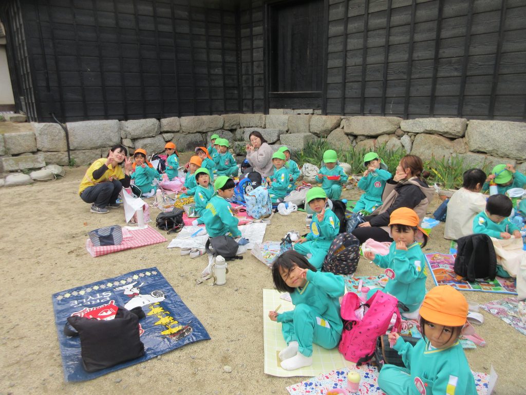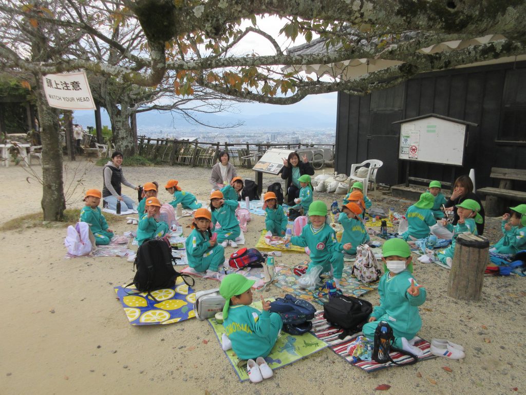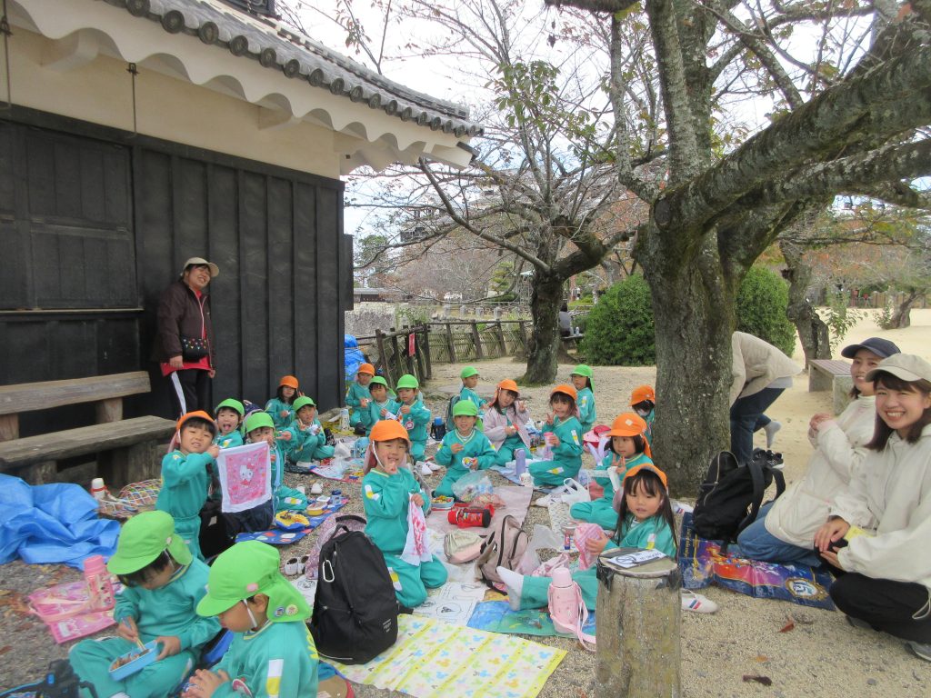 11月18日(火)年中組が遠足で「松山城」に行きました。東雲神社の階段から登りました。一段一段しっかり足を上げて頑張っていました。
