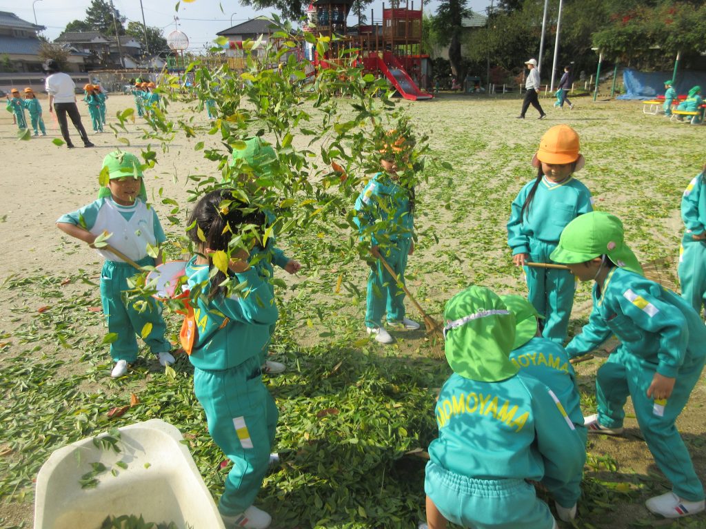 「はっぱがふってきたよー!!」「はっぱのおふとんみたい!!」と、竹ぼうきを使って、集めた葉っぱを、3・2・1・・ぱあぁ~!!と投げると、葉っぱが舞い落ちてくるのが楽しくて、何回も遊んでいました!!最後は、ほうきで集めてお掃除してくれていましたよ(*^^)v 今の時期にしか遊ぶことが出来ない環境を大切にしていきたいです(*^^)v