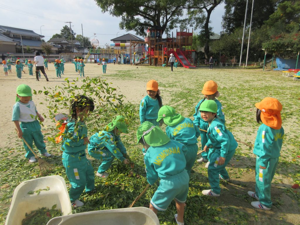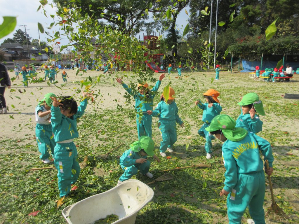 子どもたちは、園庭にはっぱがたくさん落ちているのを見て「うわぁー!!」「すごっ!!」と、言いながら、葉っぱの所に遊びに行っていました。