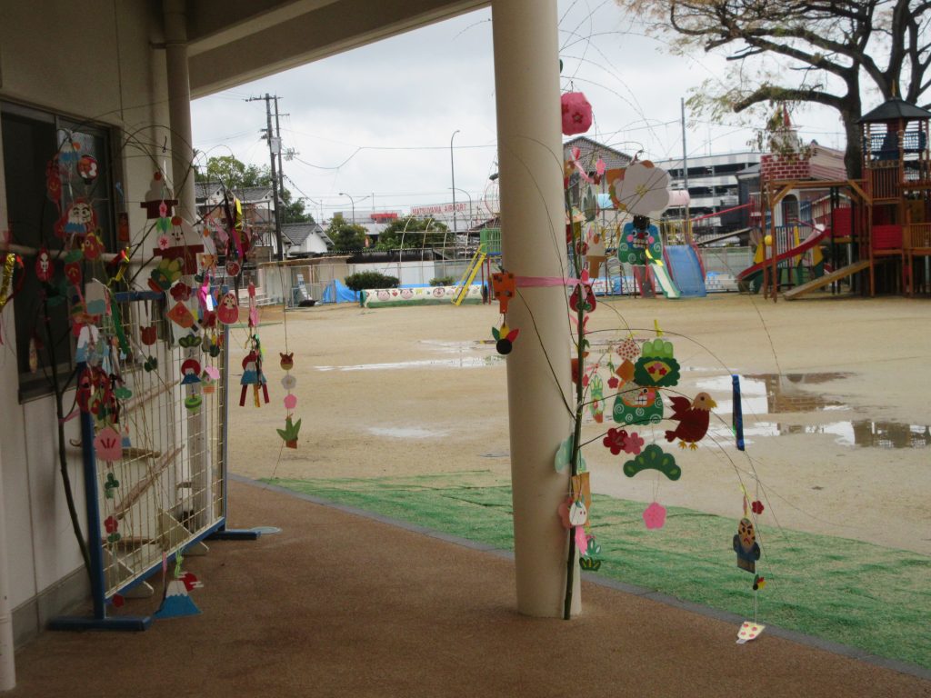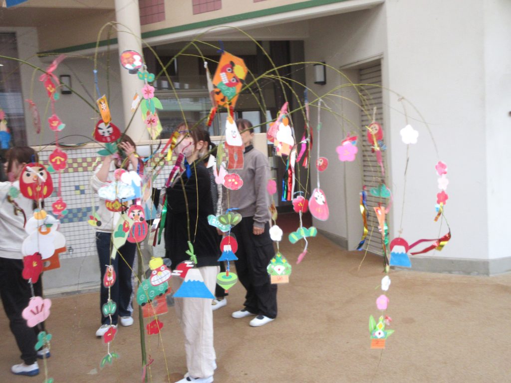 先生たちが、柳に飾りを付けているのを見た子どもたちは、「きれいー!!」「かわいー!!」と、興味津々で見ていました。