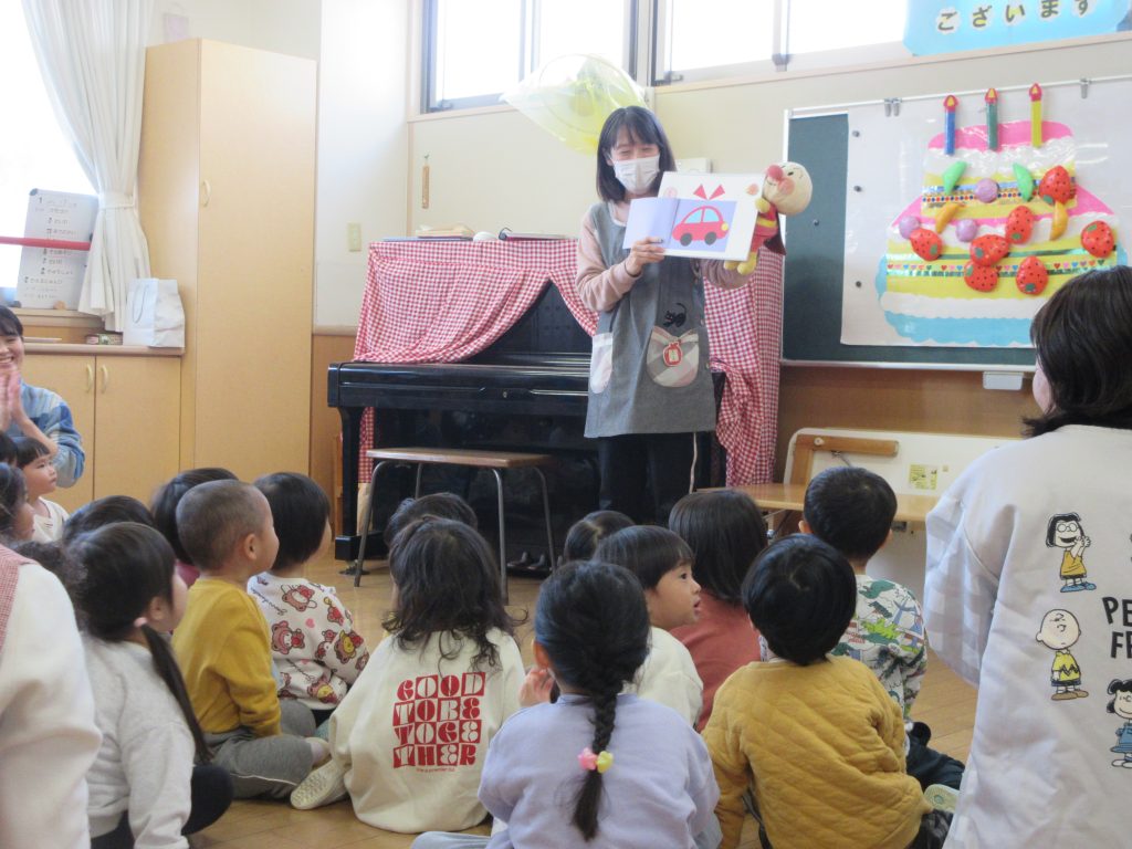 こあら組では、毎月、誕生月の保護者の方をご招待しています。誕生児さんの発表を聞いたり、ケーキを作ったりしながら、みんなでお祝いしています。先生たちの出し物もありますよ。