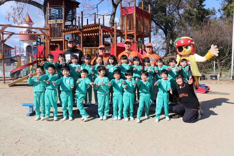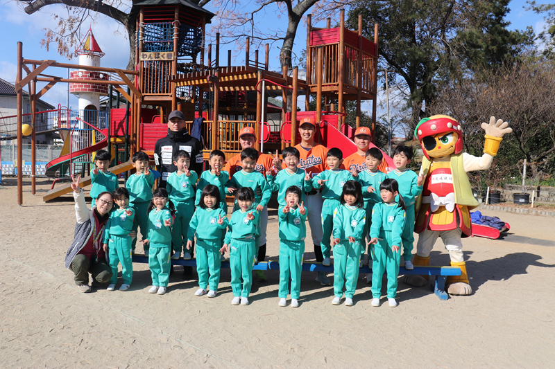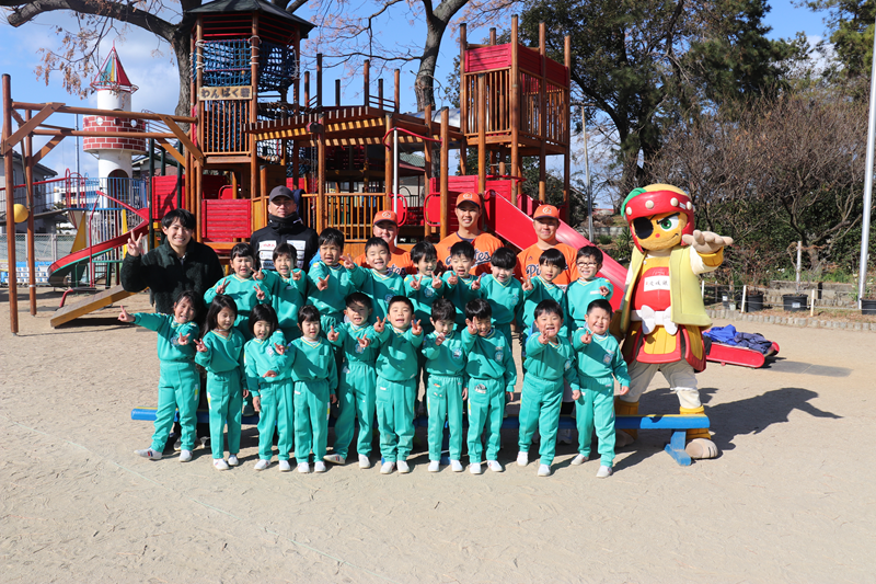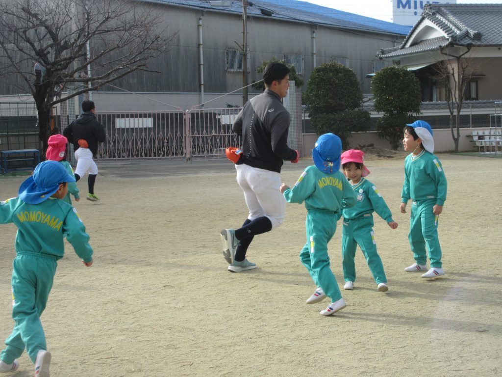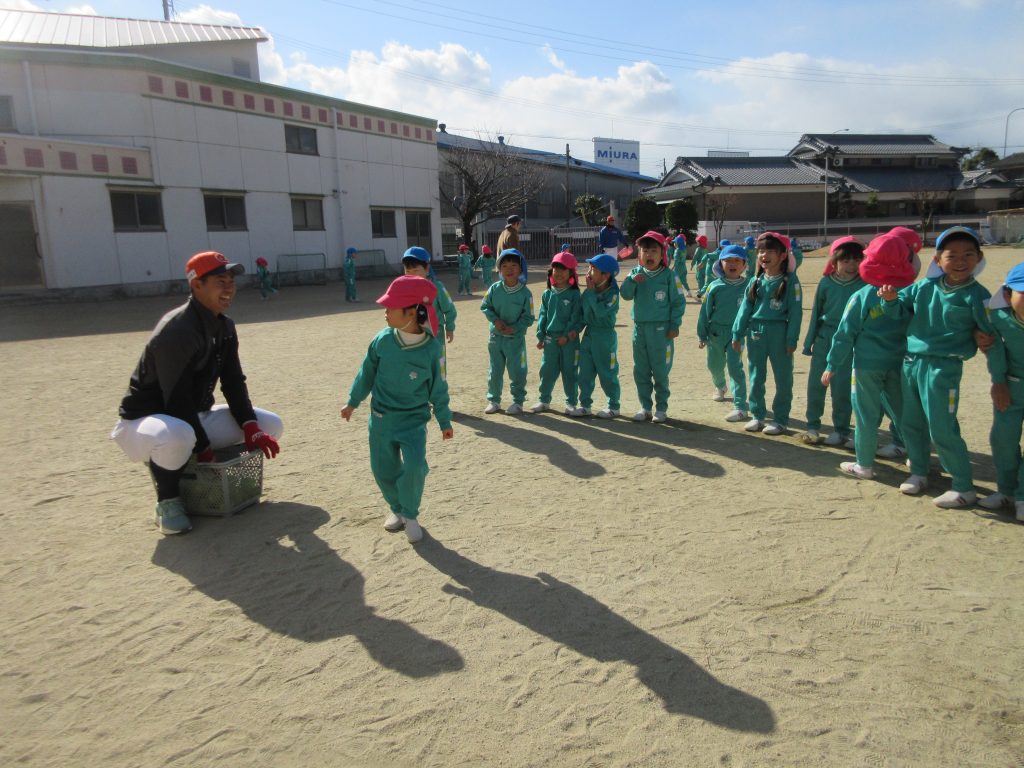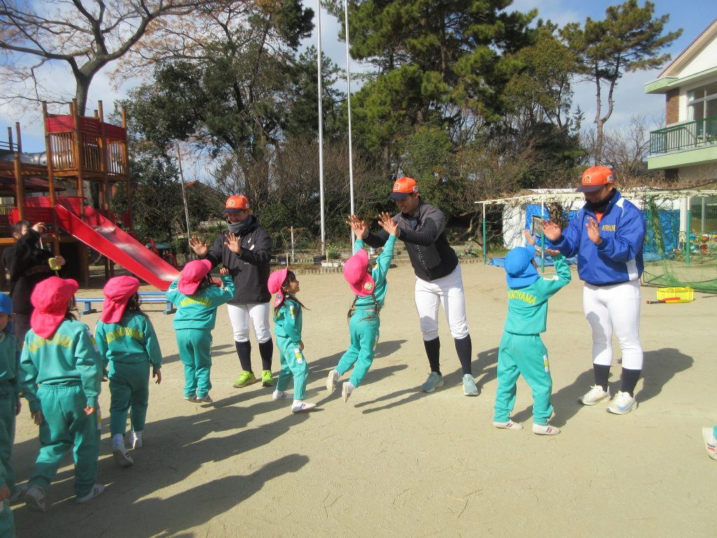 1月23日(金)「マンダリン野球教室」がありました。最初に、準備運動として、選手の方と「しっぽ取りゲーム」をしました。選手の帽子を取った人は、自分の帽子の上に重ねて被っていました( *´艸`)
