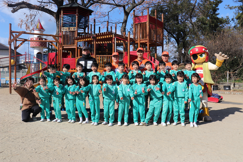 「マンダリンの試合を見にきてね。応援してね。」と、選手の方が言うと、子ども達は、「がんばれー!!がんばれー!!」と、言いながら、選手の方達と、ハイタッチをしていました☆