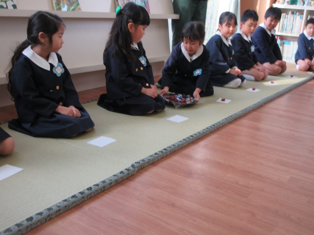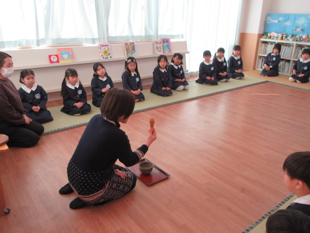 1月29日(木)・30日(金)年長組の「お茶会」が「桃山庵(とうざんあん)」で開催されました。入る時は、畳の縁を踏まずに右足から入りました。挨拶する時は、両手で三角のお山をつくり、「おねがいします」と、挨拶の作法から学びました。