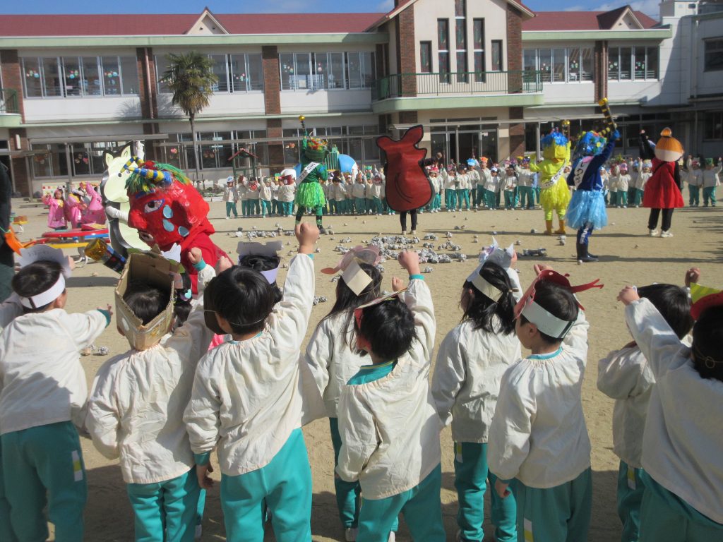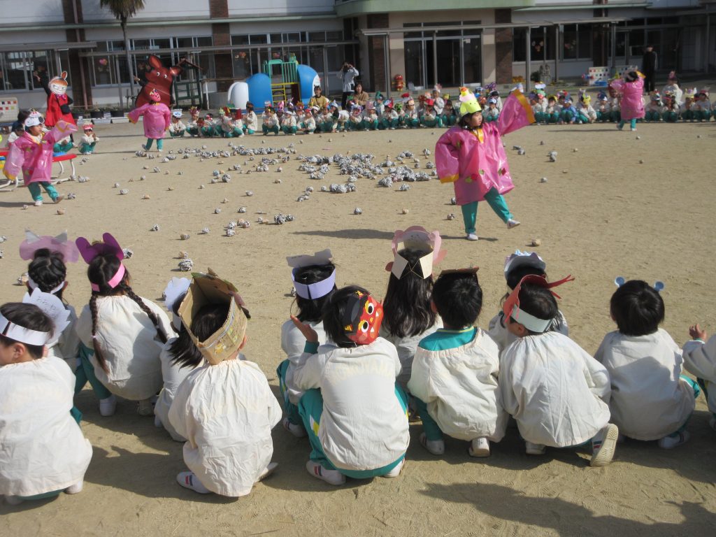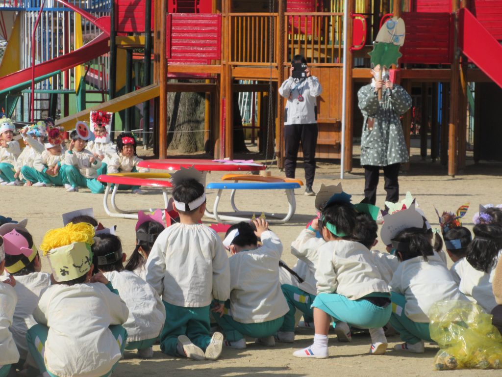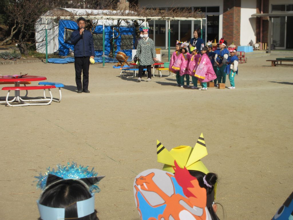 2月3日(火)「節分集会」がありました。園長先生から「春をお祝いする会ですよ。豆をまくことで、鬼さんが病気や災いを引き受けてくれます。優しい鬼さんですよ。豆まき楽しんでくださいね!!」とお話がありました。