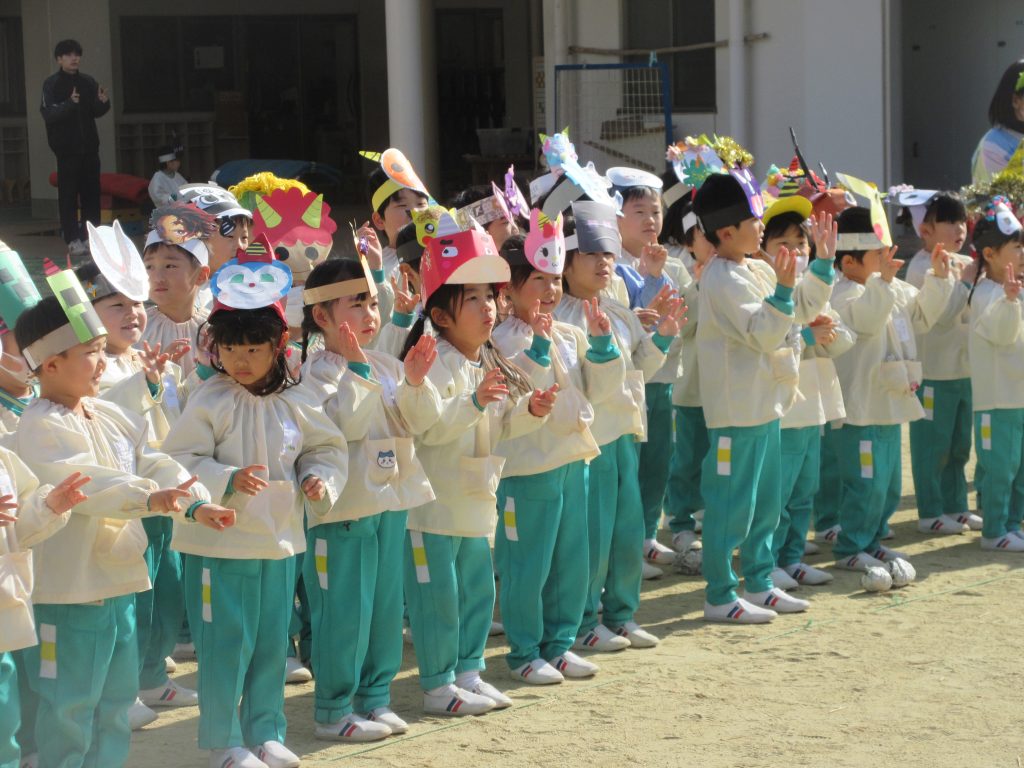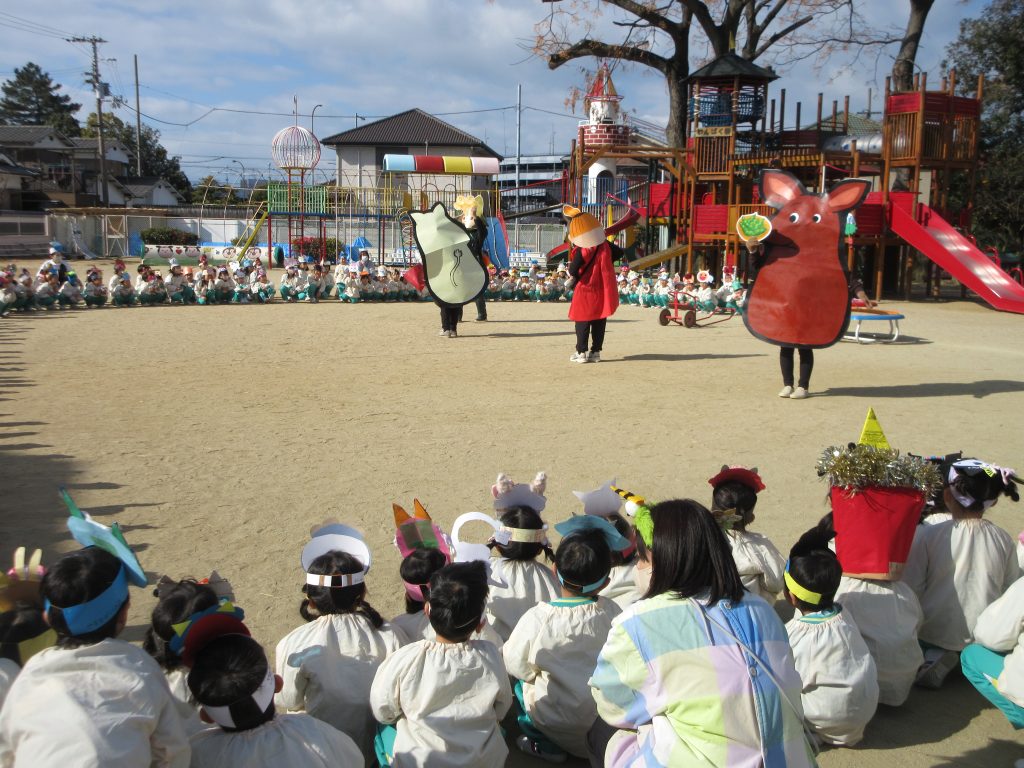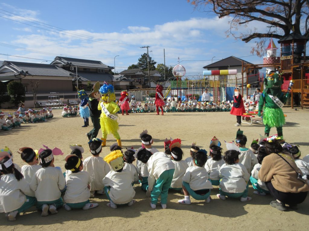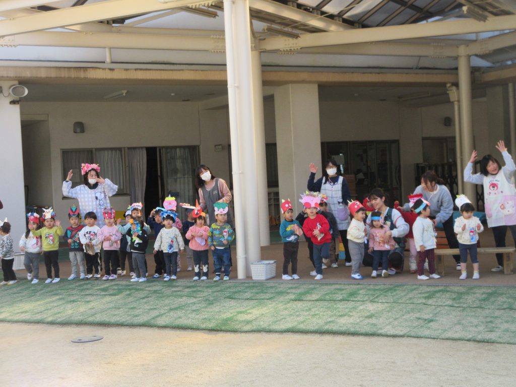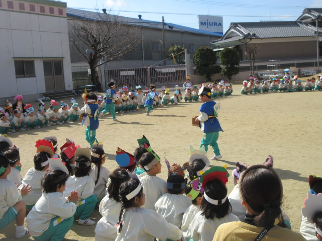 2月3日(火)「節分集会」がありました。園長先生から「春をお祝いする会ですよ。豆をまくことで、鬼さんが病気や災いを引き受けてくれます。優しい鬼さんですよ。豆まき楽しんでくださいね!!」とお話がありました。