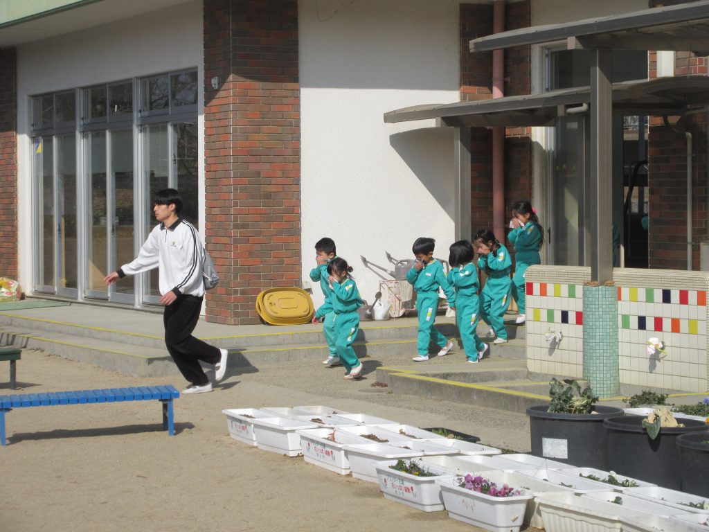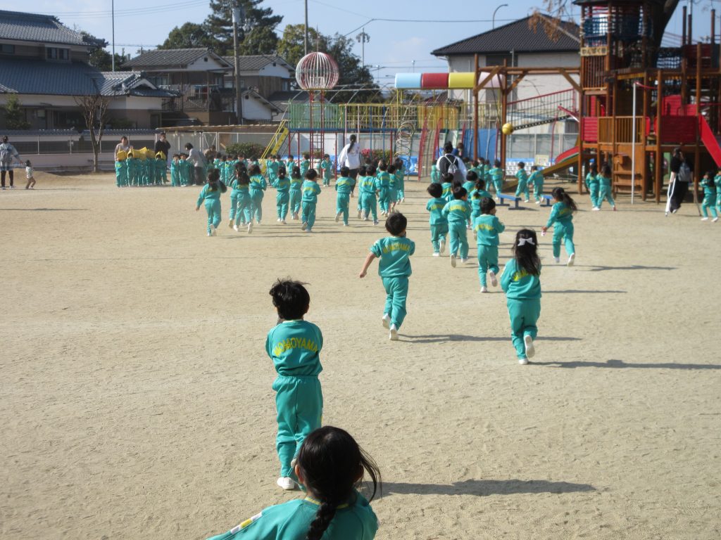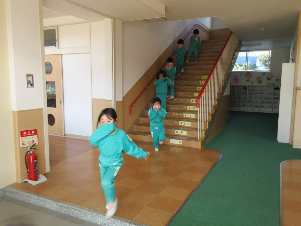 出火場所から一番遠い園庭に避難した後、園長先生からお話がありました。いろいろな訓練を想定しながら、命を守る行動を大切にしていきたいです。