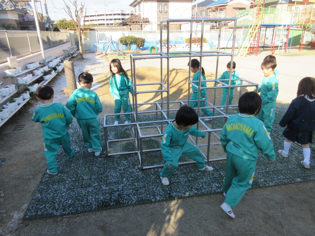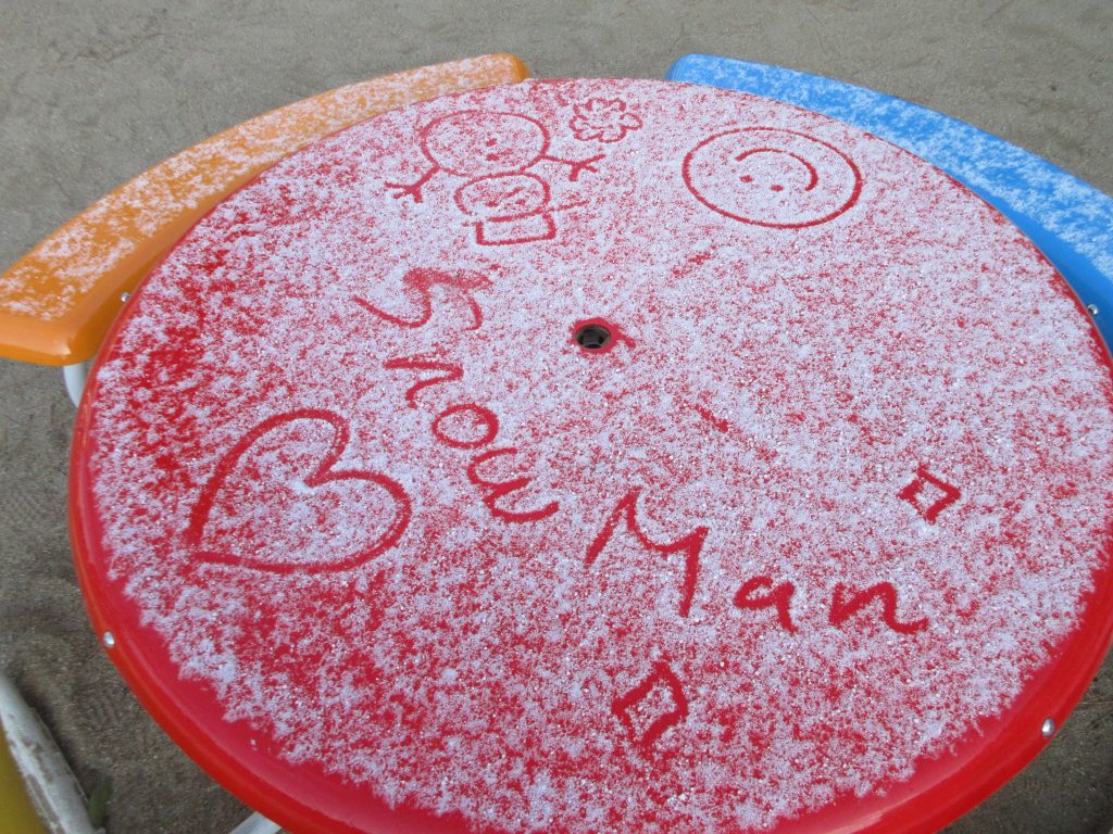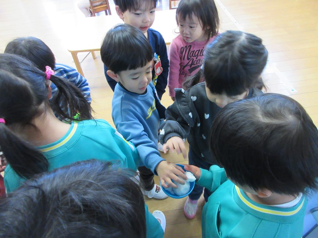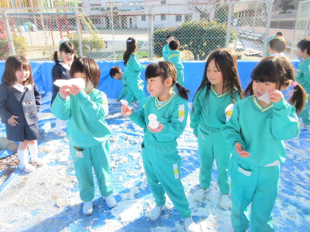 プールにも雪が積もっていたのを見つけた子どもたちは、「雪だるま」を作りました。「さむい~さむい~」と言いながらも、出来た雪だるまを見せ合って大喜びでした。その後、手を洗った子どもたちが、「おみずがあたたかかったー」と、つぶやいていました( *´艸`)