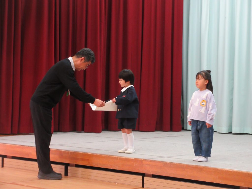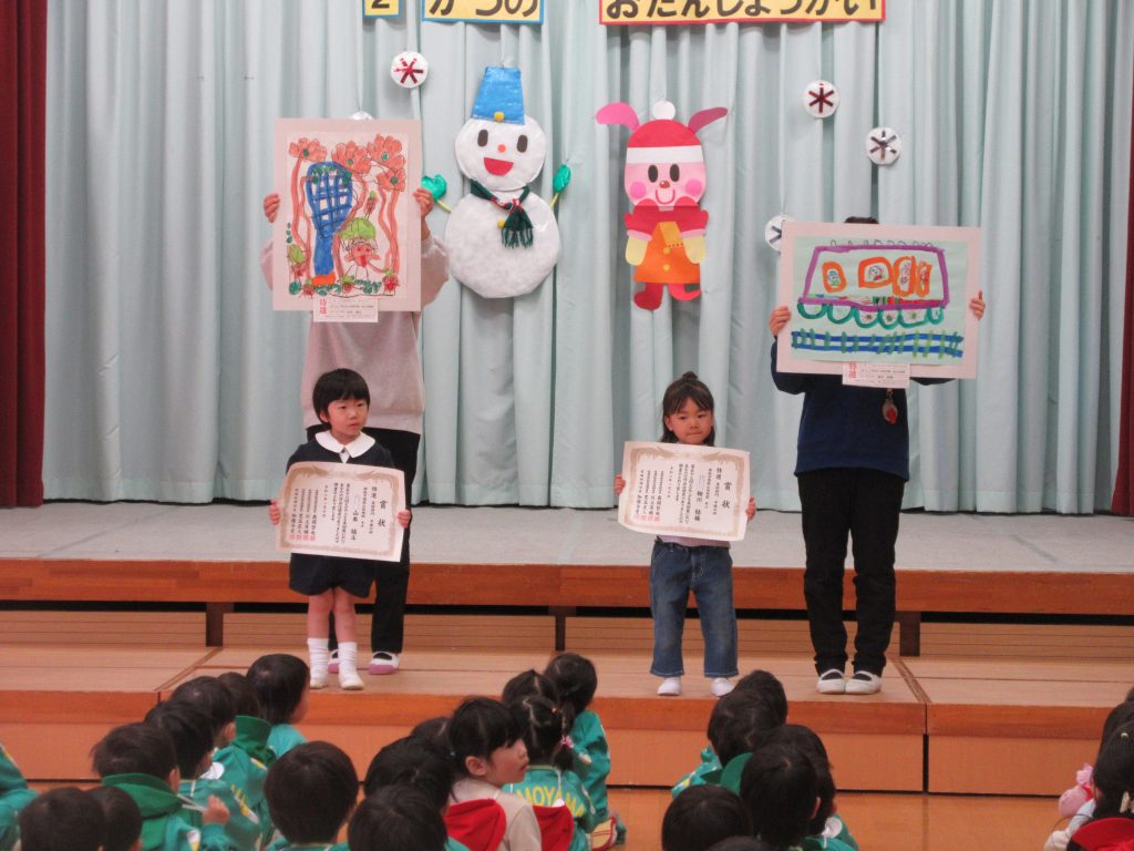 幼稚園で描いた絵を、えひめこども美術展に出品しました。たくさんの応募の中から、2名選ばれました。おめでとうございます!!表彰式では、園長先生から一人一人賞状をいただきました