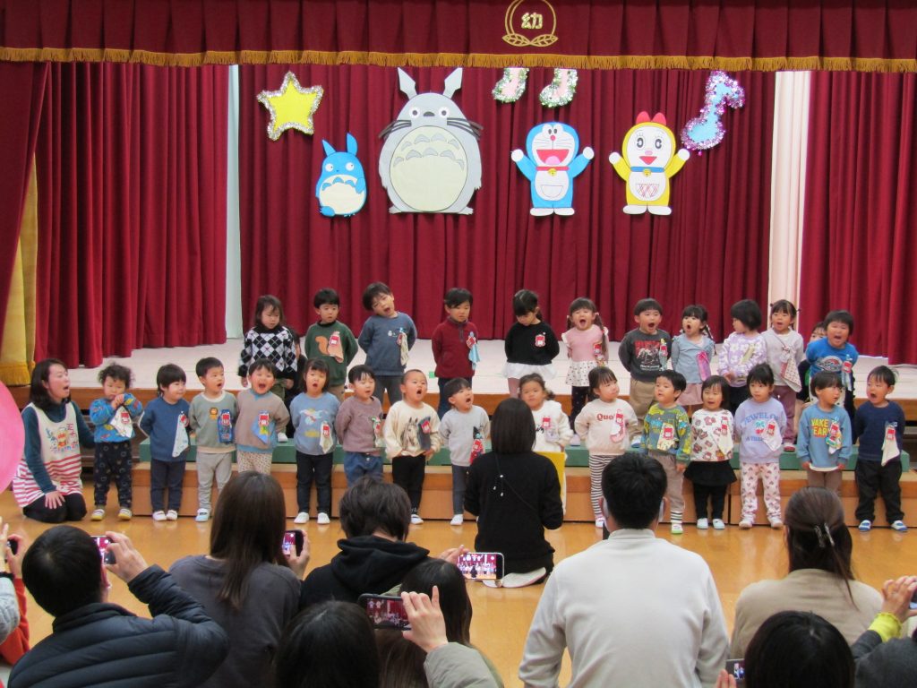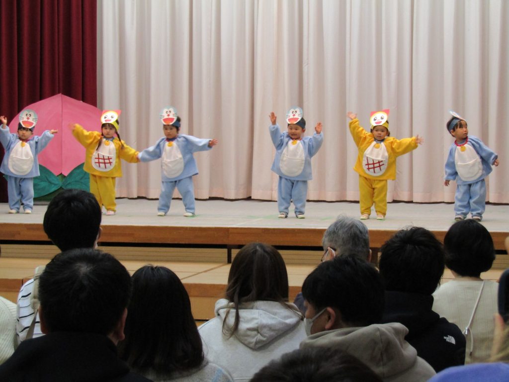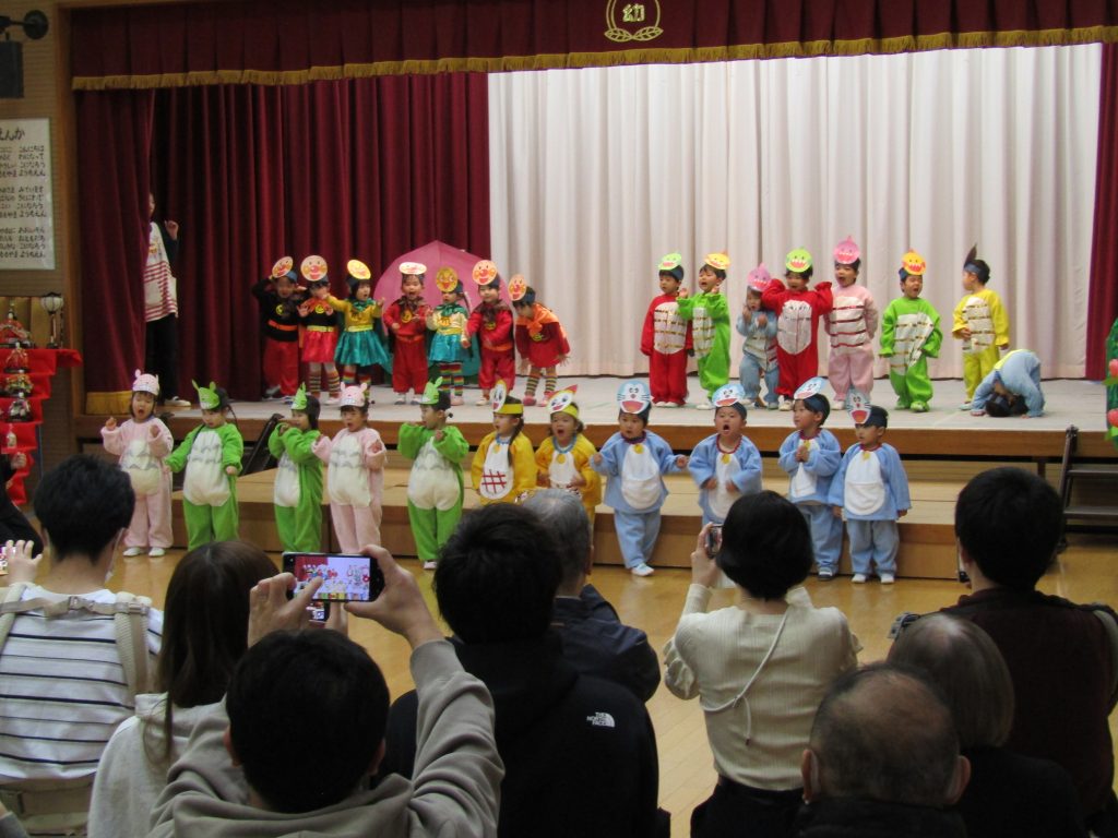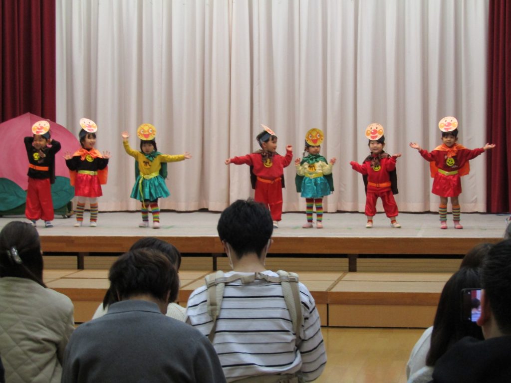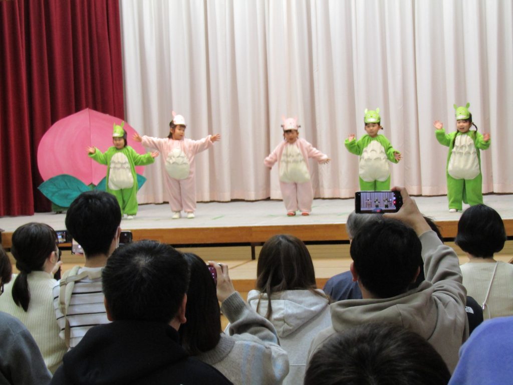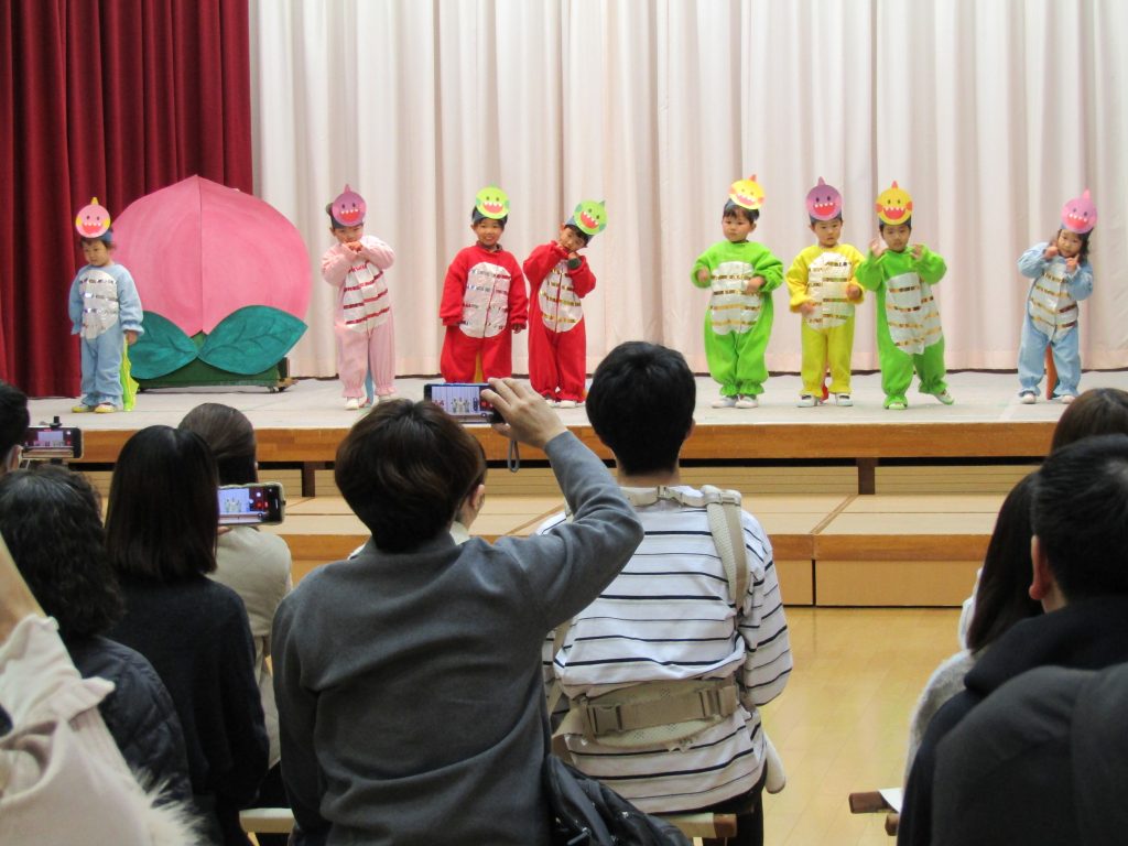 2月25日(水)こあら組の発表会がありました。劇ごっこ「おおきなもも」では、キャラクターの衣装に変身した子どもたちが、運動あそびや踊りを披露しました。
