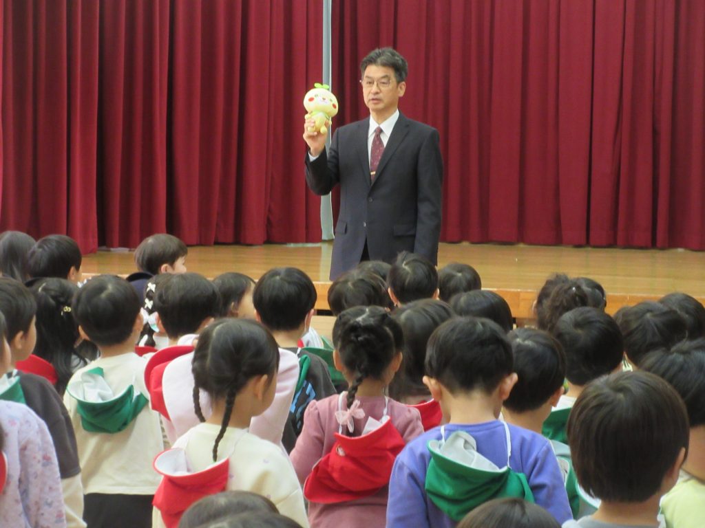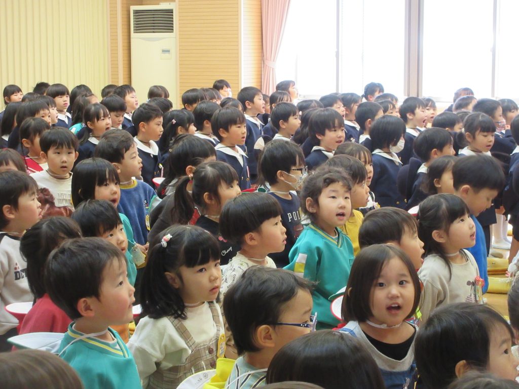 みんなで園歌を歌いました。園歌の歌詞にあるように、「あかるくやさしいこ」「がんばるげんきなこ」「つよくかしこいこ」になってくださいね。