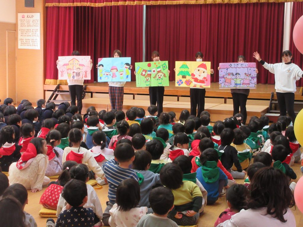 年少組の先生達が、一年間あった行事の振り返りをしてくれました。その他にも、七夕・おもちつき・豆まき等、色々な行事を経験して大きくなりましたね。